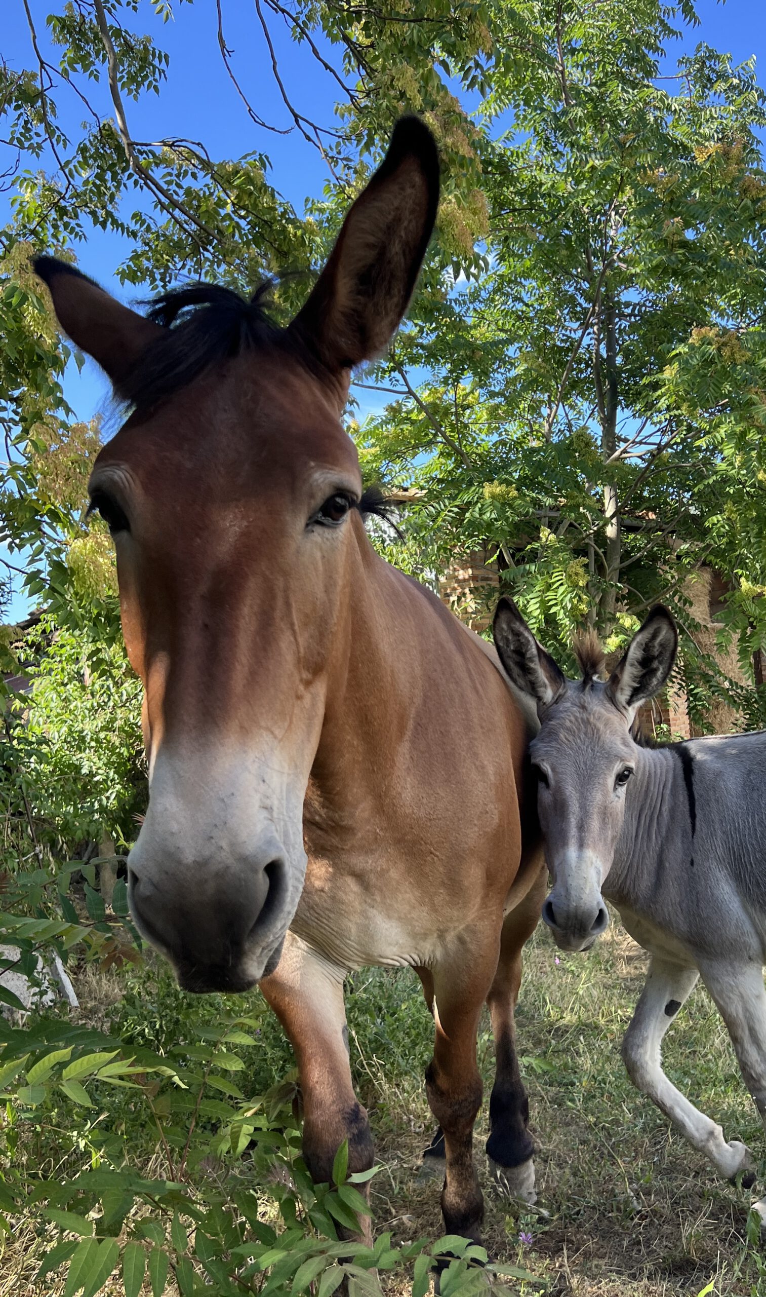 Wir haben momentan zwei ausgebildete Esel und eine Mulidame um genau zu sein, handelt es sich um eine Mauleselin.